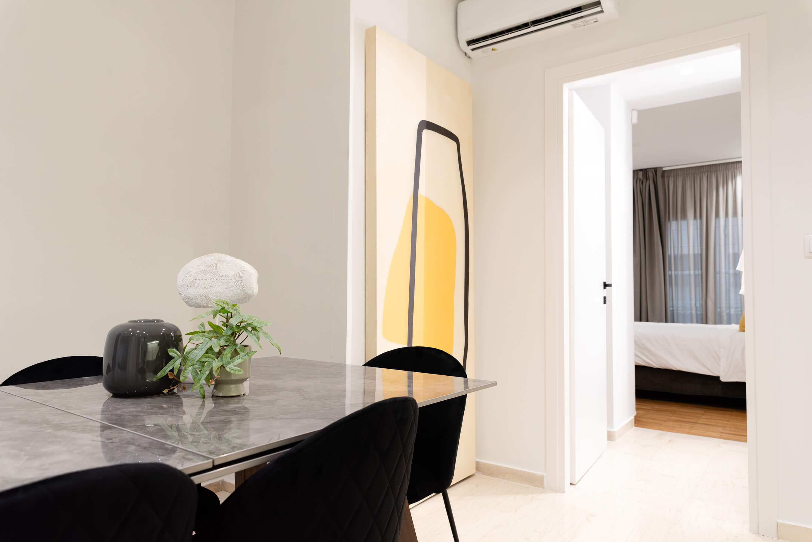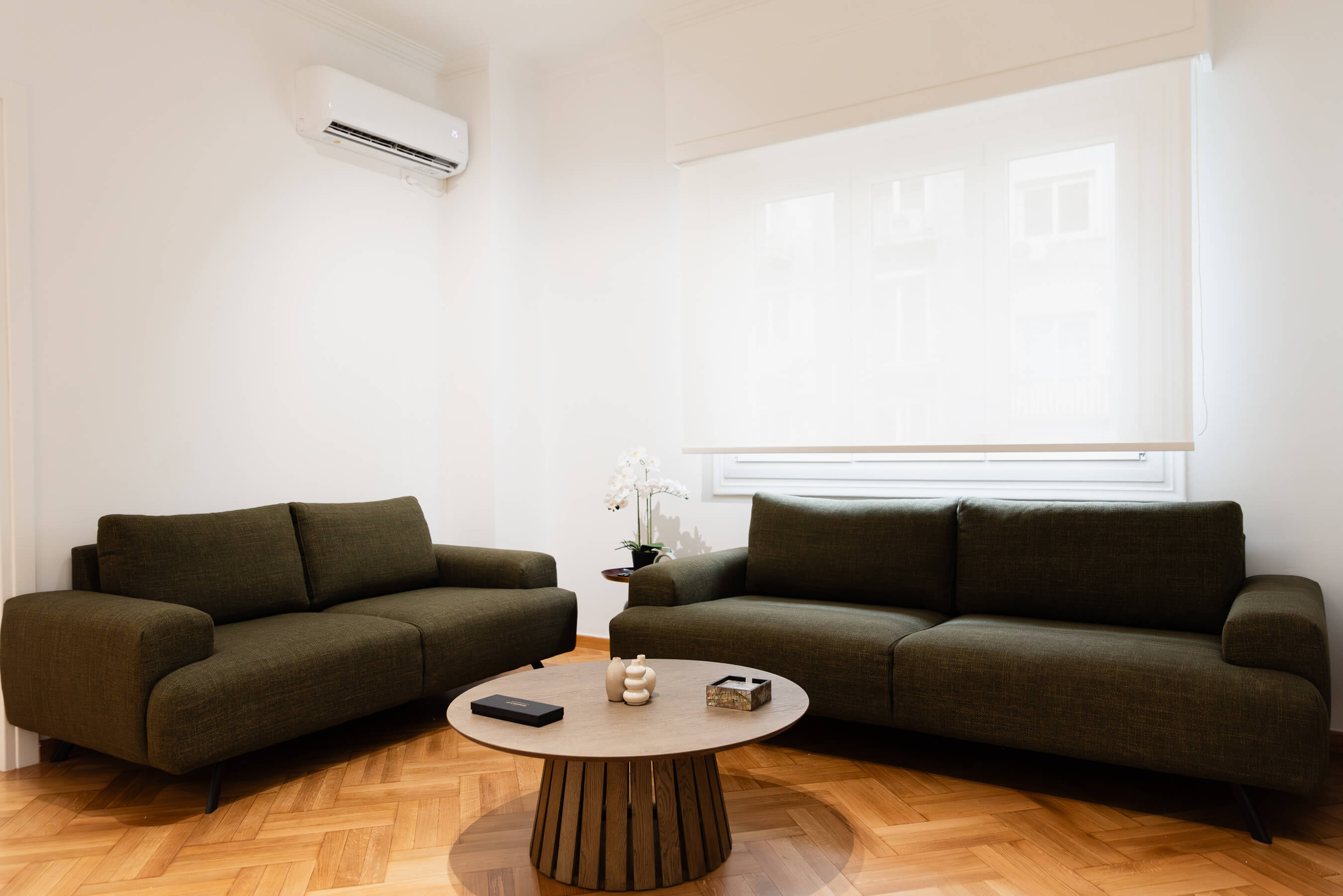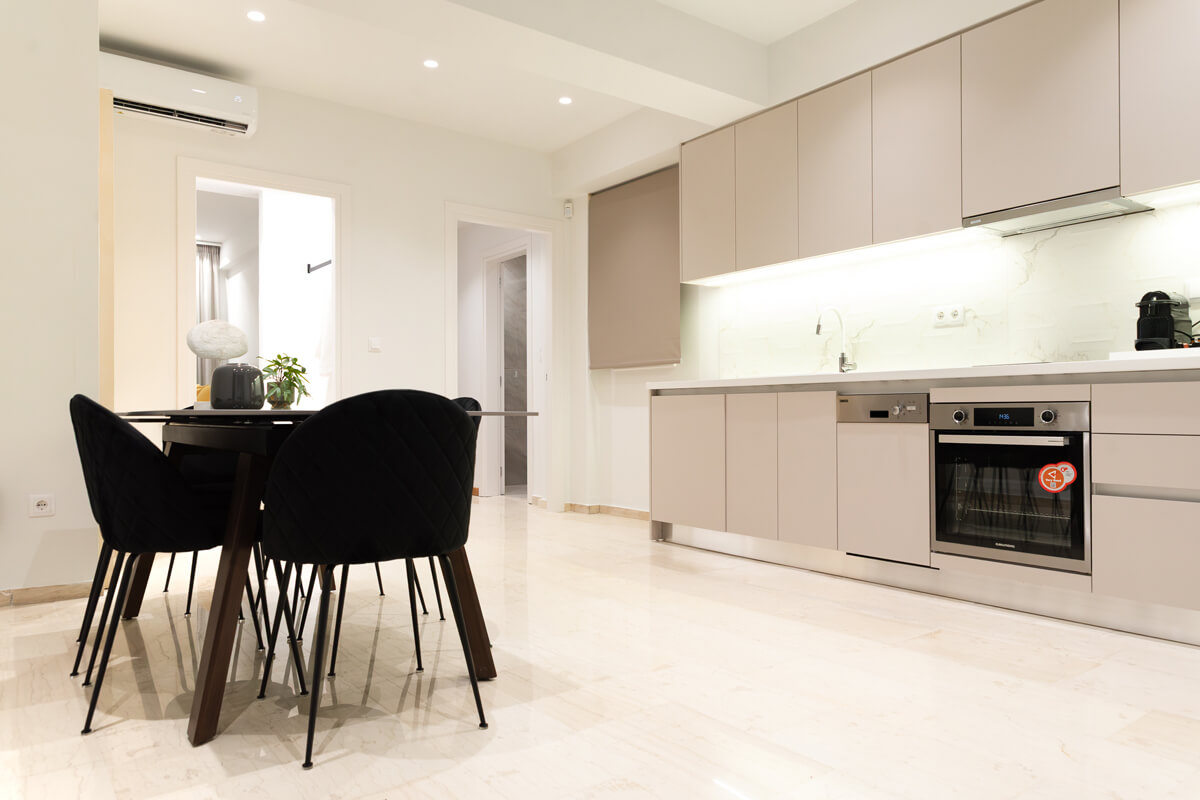 In the comfortable living room with its cozy sofas, you can relax after a day of exploring the city, while the fully equipped kitchen includes a stove, refrigerator, oven, dishwasher, and all the essentials, allowing you to prepare your meals in comfort.